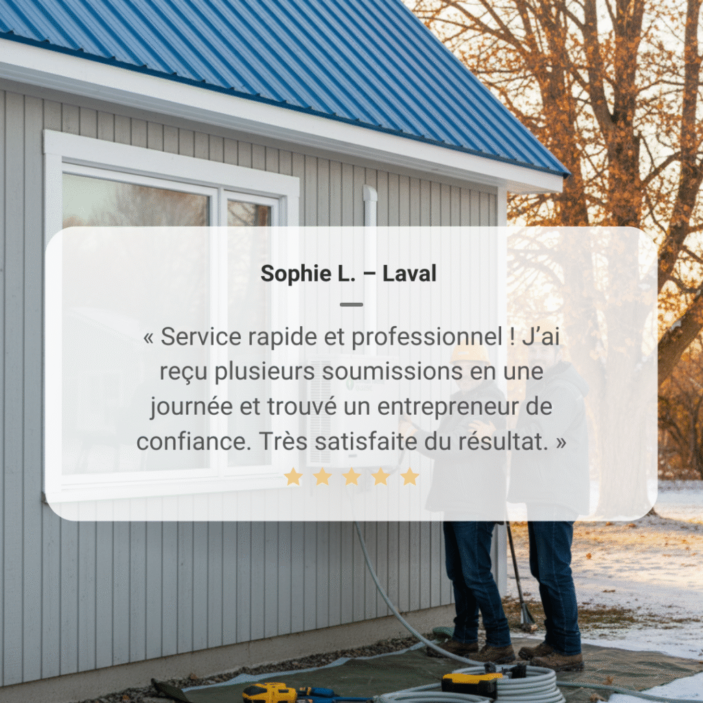 Une fois la soumission acceptée, l'installation peut être planifiée en quelques jours seulement, selon la disponibilité des entrepreneurs dans votre région. Tous nos partenaires sont certifiés, fiables et assurent un service rapide et garanti.